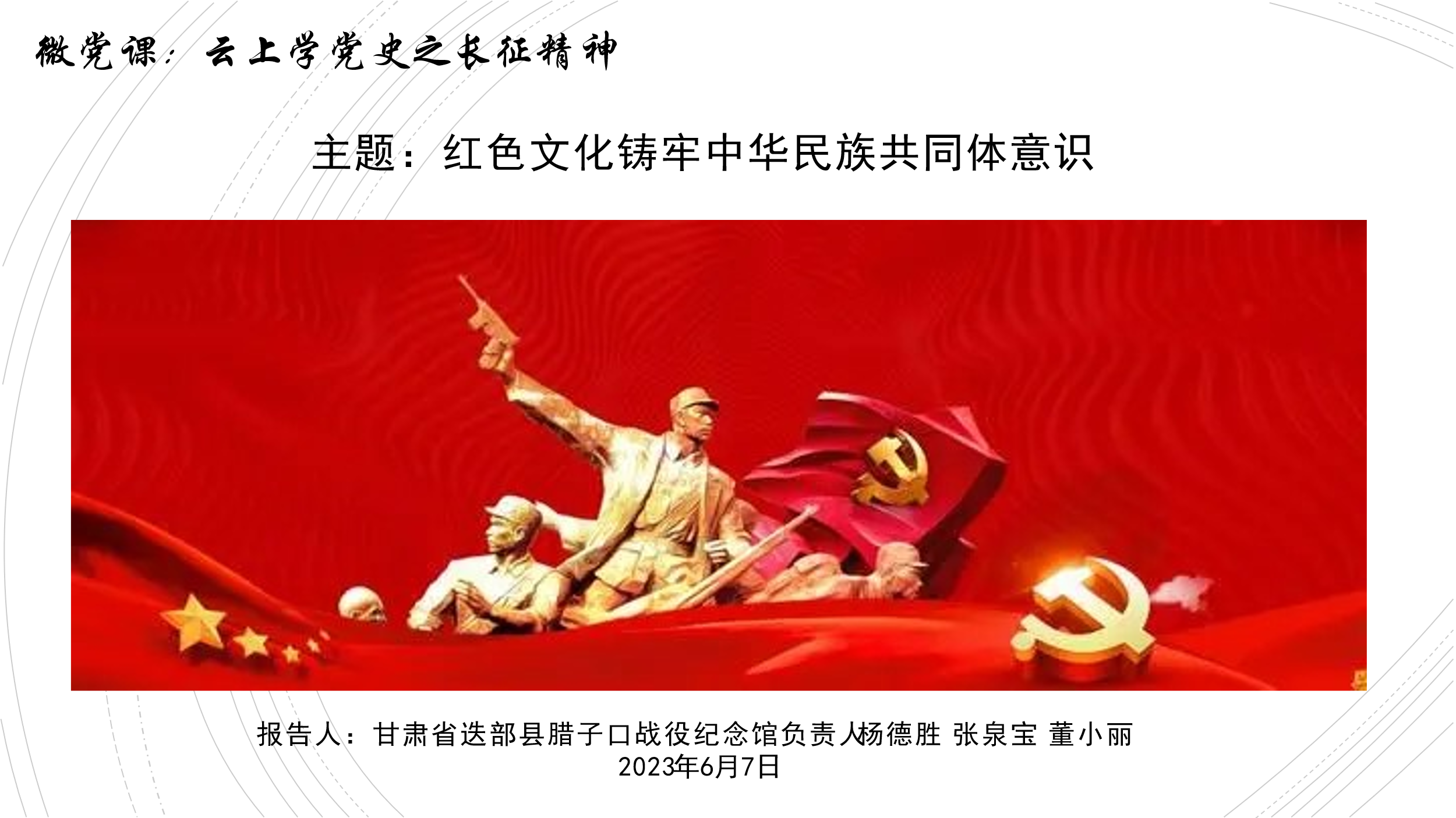 主持人王英同志明确了本次党课的教学目的和意义,并介绍了与会双方人员、宣读了党课议程。接着,腊子口纪念馆宣传教育讲解科科长杨得胜对腊子口战役及腊子口纪念馆做了介绍,腊子口战役纪念馆是全国爱国主义教育示范基地、全国红军小学建设工程爱国主义教育基地、中国延安干部学院现场体验教学点、甘肃省国防教育基地、甘肃省民族团结进步教育基地、甘肃省铸牢中华民族共同体意识教育基地。他希望通过此次联创活动能够在师生中弘扬长征精神,传承红色基因,培育爱国主义。随后,腊子口战役纪念馆金牌讲解员毛欢欢和党史研究员董小丽以云直播的形式为大家进行了精彩的线上授课,与会人员沉浸式的参观了腊子口战役纪念馆,对长征的历史和伟大长征精神有了更加丰富全面的了解。