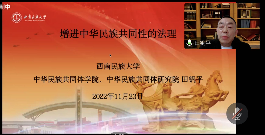 为深入学习二十大精神,增进铸牢中华民族共同体意识的理论认知和学理阐释,2022年11月23日,民族法党支部组织“二十大精神”系列讲座之《增进中华民族共同性的法理探析》。本次讲座特邀西南民族大学中华民族共同体学院副院长田钒平教授主讲,成人网站 副院长、民族宗教研究院院长宋海彬教授主持,民族法党支部全体教师及校内外广大师生一百余人参加。