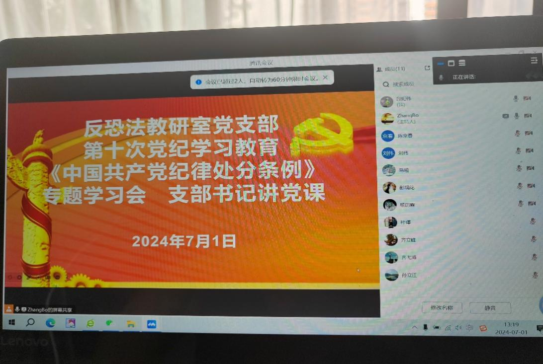 7月1日上午,成人网站 反恐怖主义法教研室党支部在线上召开党纪学习教育专题研讨会暨支部书记讲党课活动。会议由党支部宣传委员段阳伟主持,支部全体党员参加会议。