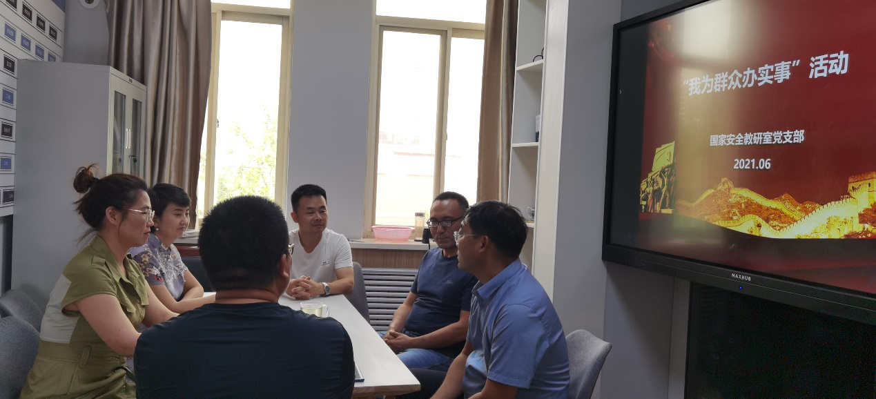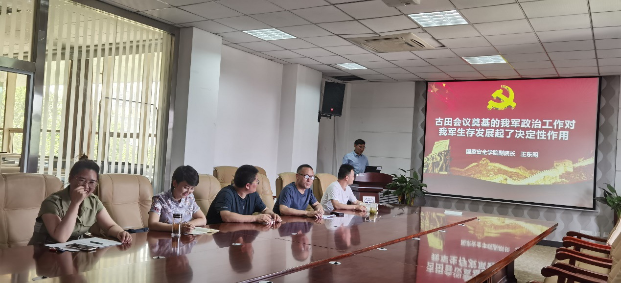 6月28日,在党的百岁生日即将到来之际,反恐怖主义法学院国家安全教研室党支部开展以“践行红船精当先锋,甘当红烛照讲台”的主题党日活动,会上,党支部联系院领导王东明副院长带领大家深入学习《古田会议奠基的我军政治工作对我军生存发展起到了决定性作用》、《继续从延安精神中汲取力量》两篇文章,对不忘初心,践行延安精神从加强理论学习,做实教学科研工作、不断开拓创新三个方面提出了具体要求。