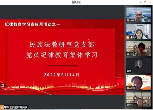 根据学院党委下发的《关于开展纪律教育学习宣传月活动的工作安排》要求,民族法教研室党支部于9月14日组织全体党员进行纪律教育集体学习会,会议由党支部书记王英主持,党支部全体党员参加,本次会议采取线上方式进行。