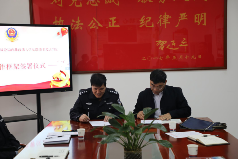)与西咸新区公安局空港新城分局举行共建教学实践基地挂牌仪式。学院党政负责同志、教师代表,空港新城分局党政领导参加座谈并出席挂牌仪式。