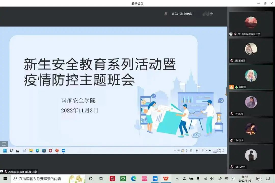 为使疫情防控知识深入学生心中,全力确保大家的生命健康和人身安全,成人网站 于11月3日晚18点30分面向全体大一新生召开2022级新生安全教育系列活动暨疫情防控主题班会。本次会议由2022级辅导员张婕妮老师主讲,全体2022级新生通过腾讯会议形式线上参与。