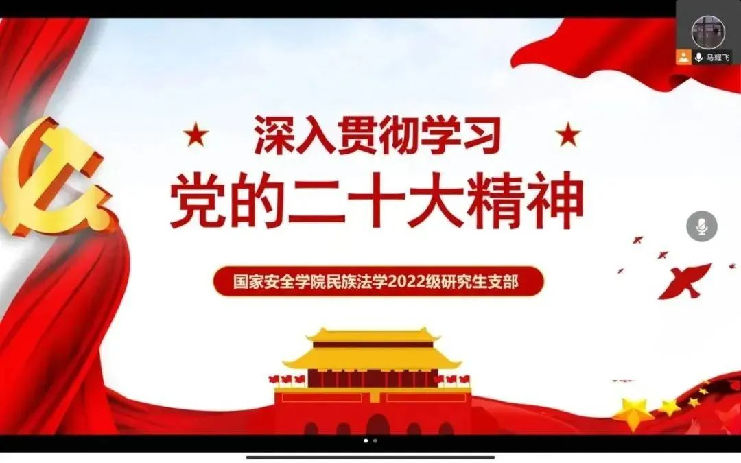 为深入学习贯彻党的二十大报告,认真落实党的二十大精神,全面提高学生思想政治素质,筑牢理想信念之基,成人网站 民族法学2022级研究生团支部于2022年11月10日通过线上会议的形式开展了以“深入贯彻学习党的二十大精神”为主题的团日活动。全体同学积极参与。
