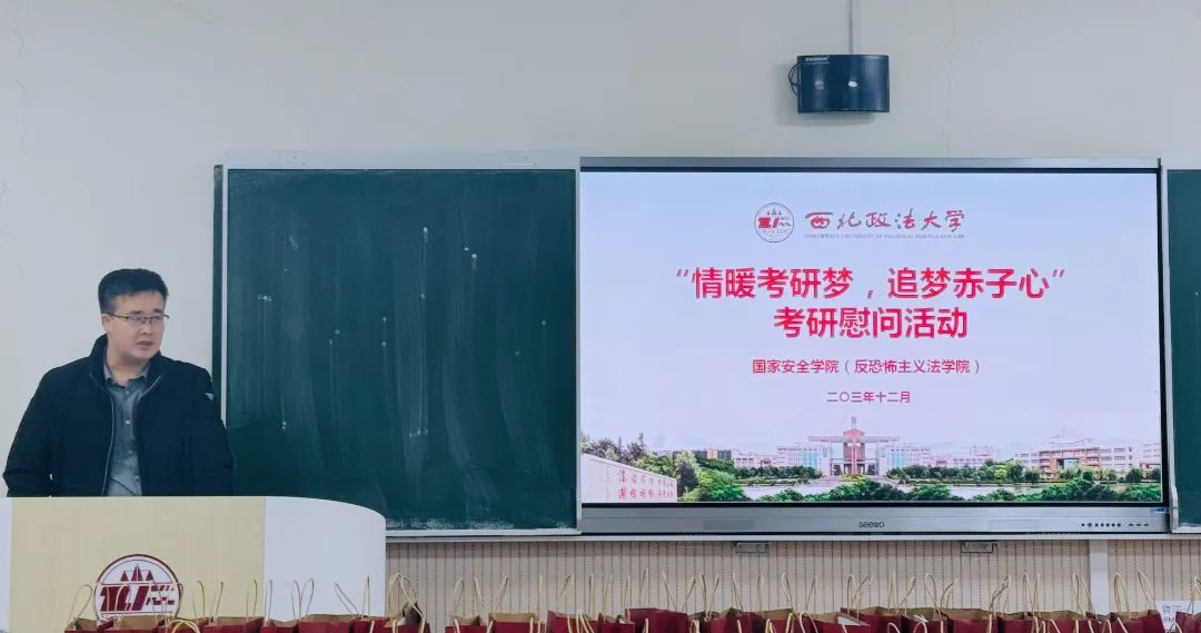 为增强各位考研学子信心,表达学院关怀,缓解学生备考压力,帮助同学们更好地备战2024年全国硕士研究生统一招生考试,成人网站 (反恐怖主义法学院)于12月19日在天平楼A107教室召开考研慰问活动,并发放慰问礼品,为考研学生送去温暖与关切。本次活动由辅导员王真老师主持,学院党委副书记、副院长刘卫波老师、辅导员张婕妮老师及全体考研同学参加。