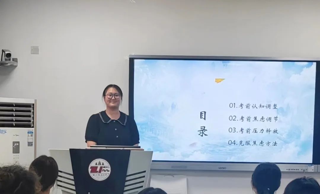 陈依卓同学从考前认知调整、考前焦虑调节、考前压力释放与克服焦虑方法等多个角度出发,结合生动的案例,给出相关的学习建议,更好地帮助同学们释放紧张情绪,建立信心,以更加积极的心态面对即将到来的期末考试。