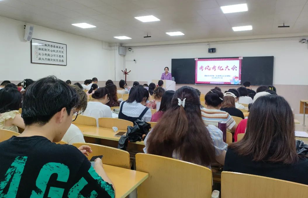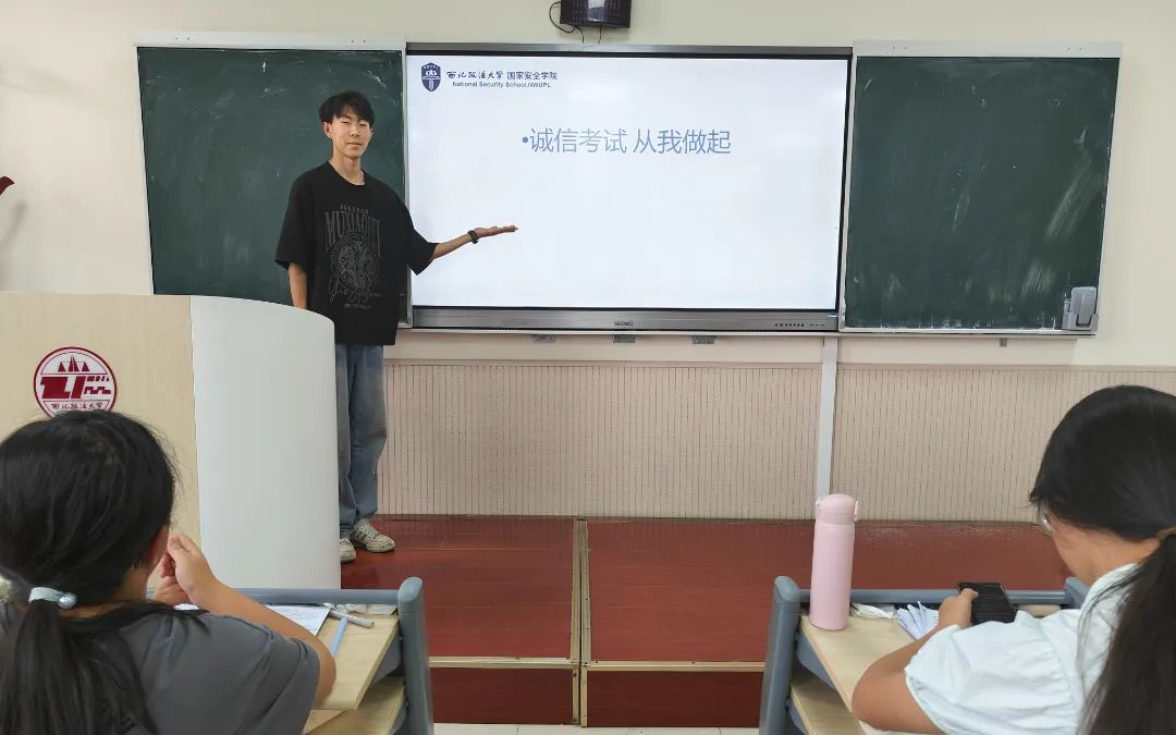 辅导员老师结合事例向同学们讲解了诚信考试的重要性,同时强调了诚信考试不仅是对知识的尊重,更是责任感和道德品格的体现。随后,各班班长带领大家领学了《成人网站 学生违纪处分规定》(节选)中的相关内容,号召同学们诚信应试,严守考风考纪。
