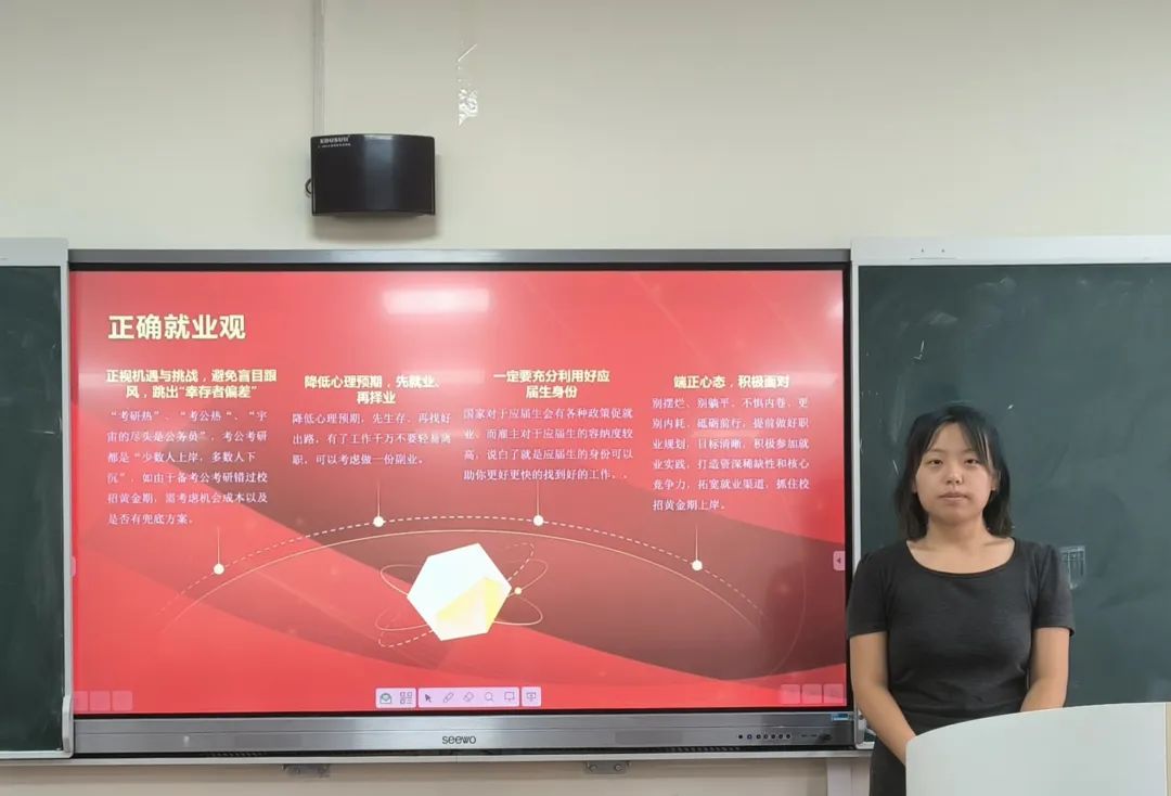 2023级2班团支书杨婧从正视机遇、降低心理预期、端正心态等方面详细讲述正确就业观的内涵。