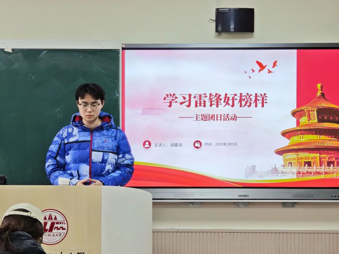 胡嘉浩同学系统讲述了雷锋同志的生平事迹和雷锋精神的思想精髓,对雷锋日记中"螺丝钉精神"和"为人民服务"等核心理念进行重点解读。同学们认真聆听,并通过互动问答深化了对新时代雷锋精神的理解。