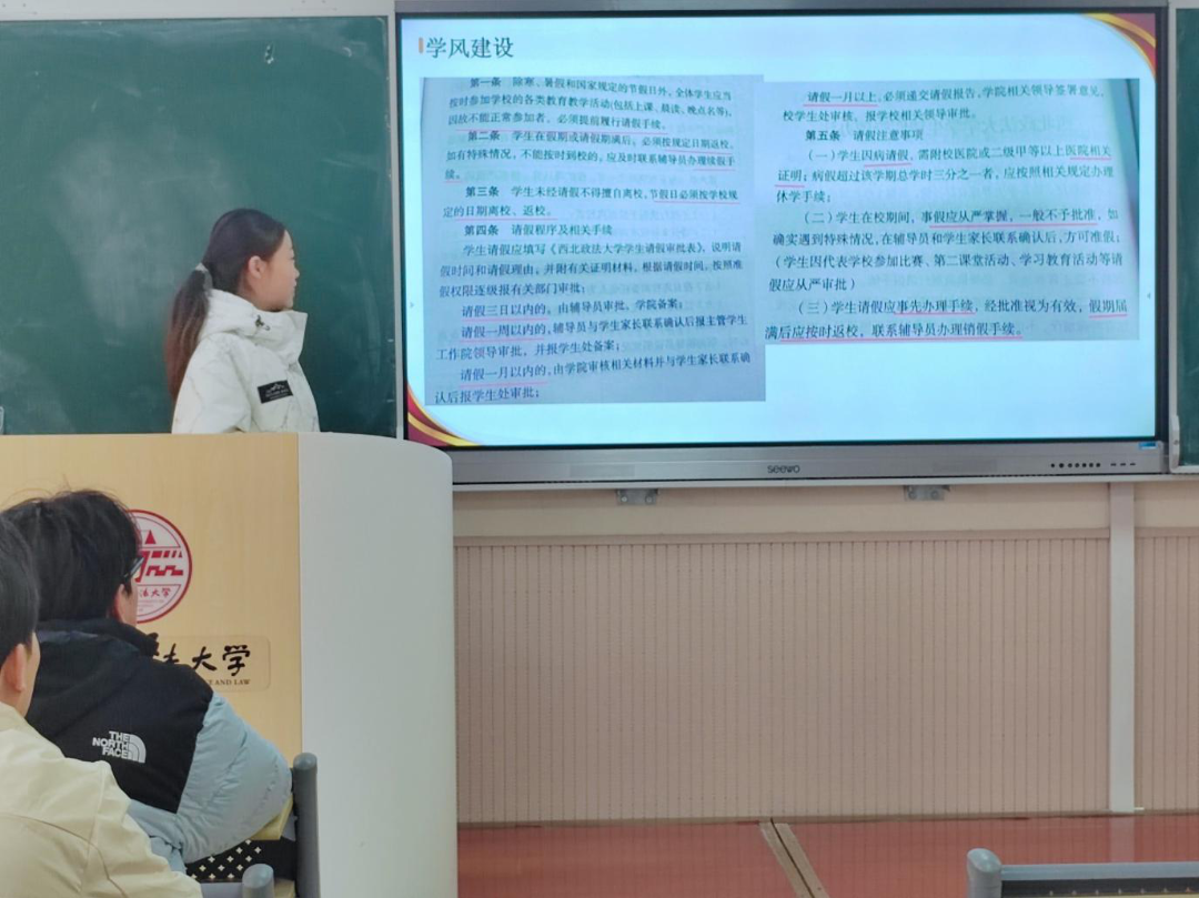 为增强学生纪律意识,营造良好课堂环境,成人网站 (反恐怖主义法学院)2022级1班于3月31日召开学风建设主题班会,本次班会由学习委员周紫嫣同学主持,2022级1班全体同学参与。