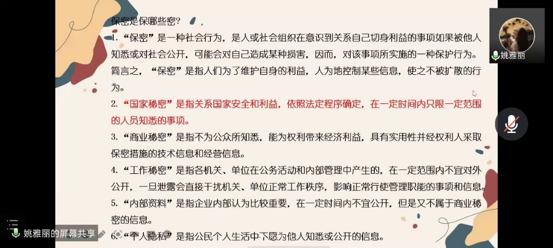 同时,姚雅丽同学也介绍了《保密法》和《刑法》中关于保密责任的规定。