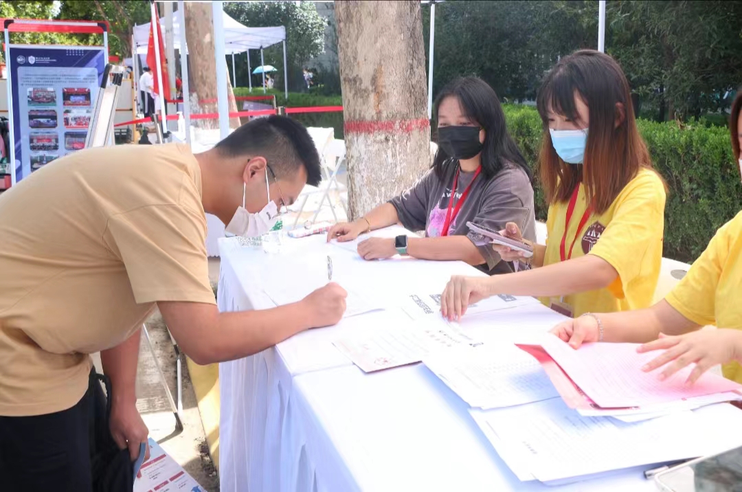8点左右,新生们陆续来到学院摊位进行开学报道。扫描录取通知书后,新生们来到学院摊位。摊位上的学长学姐们为新生扫描通知书,发放校园卡和澡卡,他们仔细审查返校申请,提醒新生提交体温记录表和健康承诺书,严格执行校园防疫措施,为新生安全健康保驾护航。
