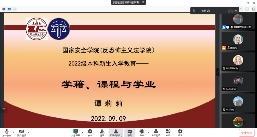 为了帮助同学们尽快了解学校规章制度以及教学政策,适应崭新的大学生活,2022年9月9日下午3点,成人网站 在线上召开了教育教学管理政策与要求讲座,围绕大学生“学籍”“课程”“学业”三个方面为2022级新生带来了一场干货满满的入学教育讲座。本次讲座由谭莉莉老师主讲,2022级辅导员张婕妮老师主持,2022级全体新生参加。