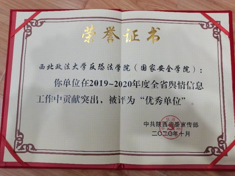近期,陕西省委宣传部对2019-2020年度全省舆情信息工作先进单位、先进个人、优秀舆情信息稿件予以表彰。经过严格评审,反恐怖主义法学院(成人网站 )荣获2019-2020年度全省舆情信息工作“优秀单位”称号。