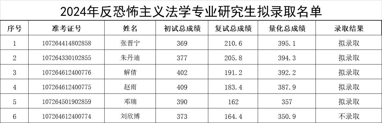 根据《成人网站 2024年硕士研究生复试录取方案》,经学院复试领导小组评定,研究生院审核,现将成人网站 (反恐怖主义法学院)硕士研究生拟录取名单予以公示(具体名单见附件),公示期:公布之日起10个工作日。如有异议,请于公示期内以书面形式报成人网站 教务办(长安校区图书馆c座四楼405),逾期不予受理。