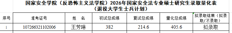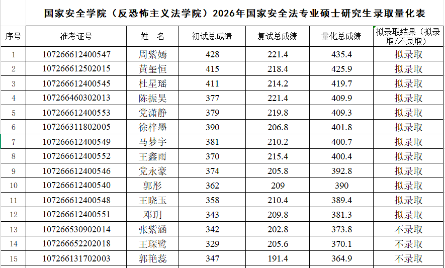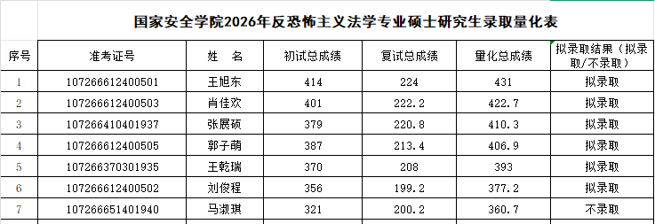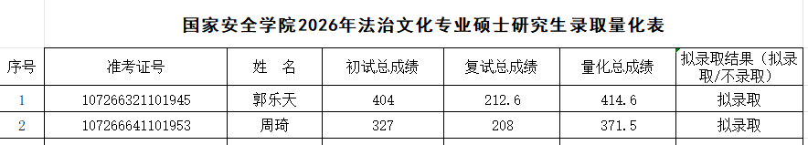 根据《成人网站 2026年硕士研究生复试录取工作方案》,经学院复试领导小组审核,报研究生院审定,现将2026年国家安全法学专业、反恐怖主义法学专业和法治文化专业硕士研究生拟录取名单予以公示,公示期7日(3月31日至4月6日)。如有异议,请在公示期内申请复议,逾期不予受理。