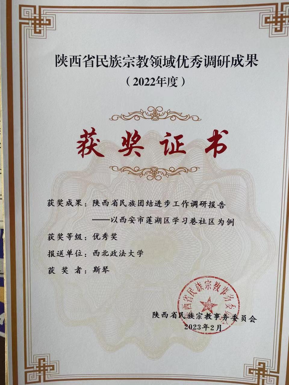 2023年2月,成人网站 教师两项调研成果荣获陕西省民族宗教领域优秀调研成果奖。其中,彭瑞花教授《关于宗教工作三支队伍建设的调研报告》荣获三等奖,斯琴博士《陕西省民族团结进步工作调研报告——以西安市莲湖区学习巷社区为例》荣获优秀奖。
