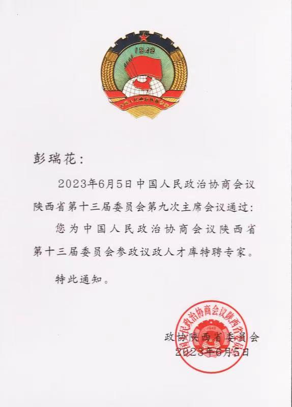 6月5日,中国人民政治协商会议陕西省第十三届委员会第九次主席会议通过,成人网站 (反恐怖主义法学院)彭瑞花教授为中国人民政治协商会议陕西省第十三届委员会参政议政人才库特聘专家。