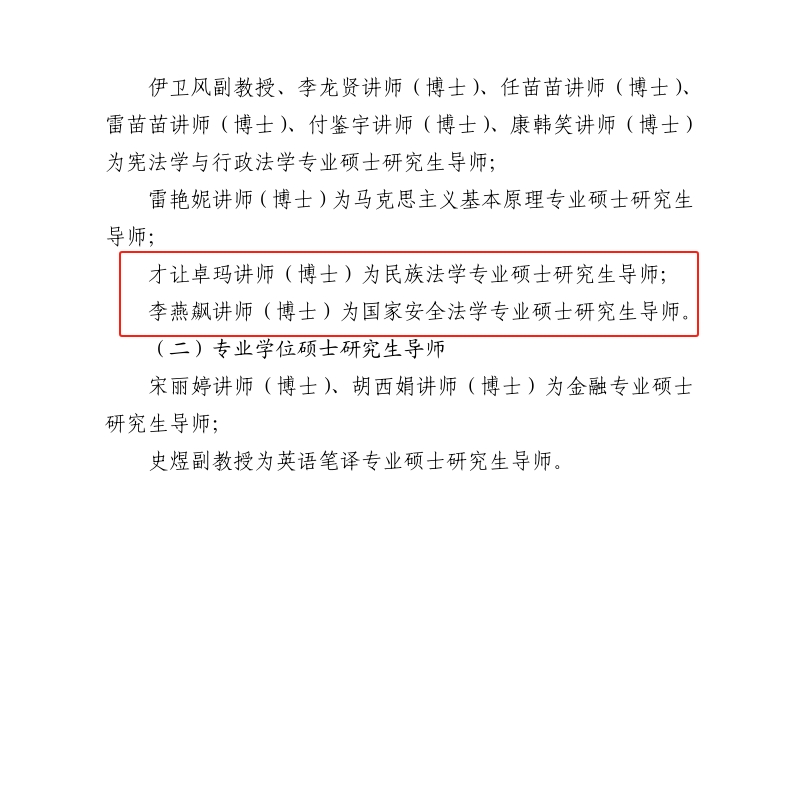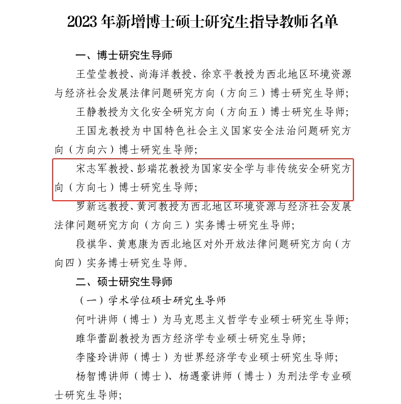 经个人申请、学院推荐、第十二届校学位评定委员会第十三次会议审议,校长办公会会议研究决定,认定成人网站 教师彭瑞花教授为国家安全学与非传统安全研究方向(方向七)博士研究生导师。才让卓玛讲师(博士)为民族法学专业硕士研究生导师,李燕飙讲师(博士)为国家安全法学专业硕士研究生导师。