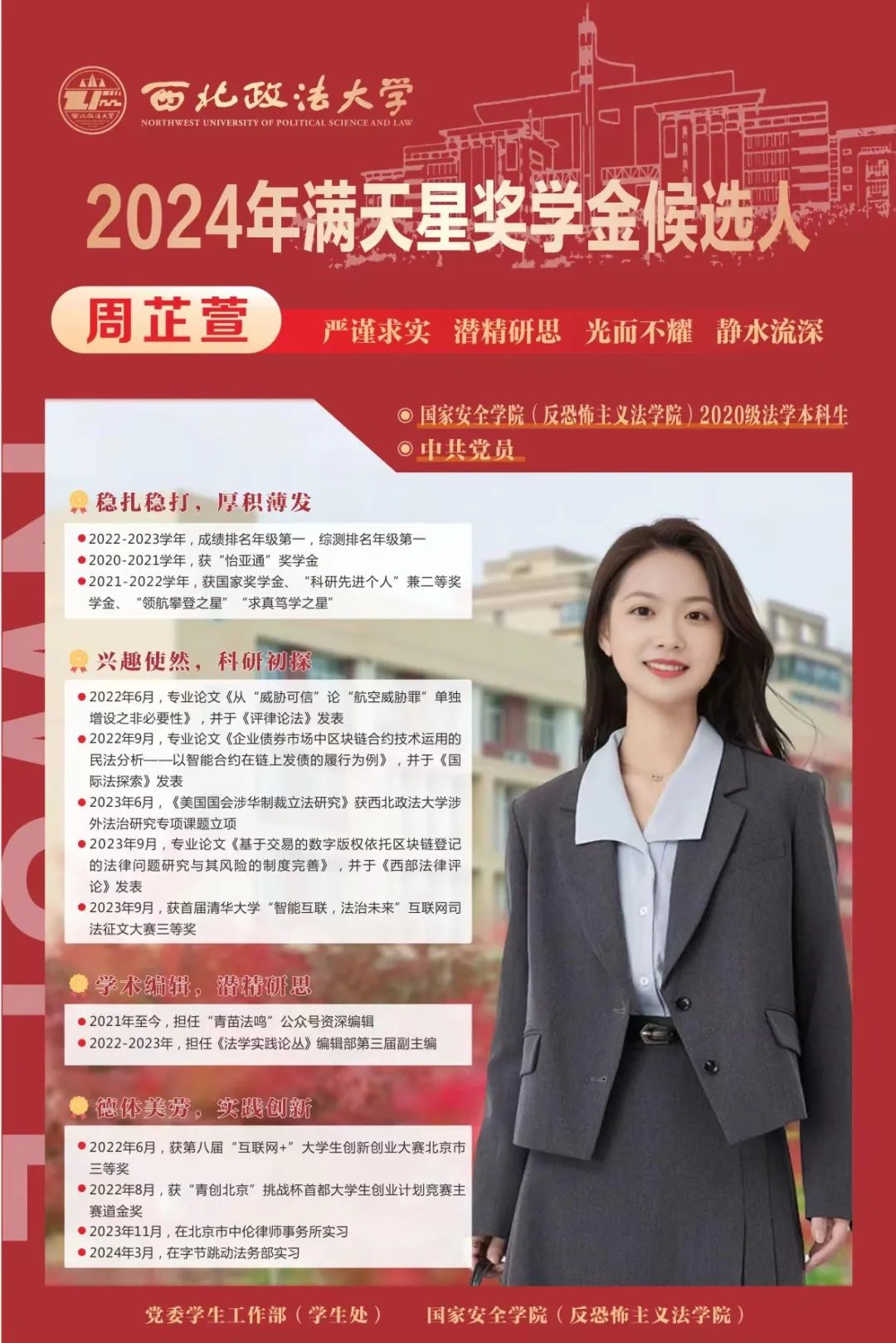 在学院领导老师的耐心指导下,经过充分准备与仔细打磨,周芷萱同学以96.41分的优异成绩,荣获2024年“闪耀西法大”满天星奖学金。希望学院学子以周芷萱同学为榜样,博学躬行,为谱写法治中国新篇章贡献青春力量。