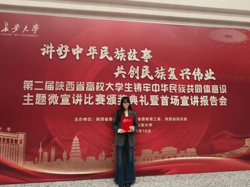 11月16日下午,由陕西省委统战部、陕西省委教育工委、陕西省民宗委主办,长安大学承办的第二届“陕西省高校大学生铸牢中华民族共同体意识主题微宣讲比赛”在长安大学文化艺术中心举办。成人网站 (反恐怖主义法学院)2022级本科生吴静娴以“讲好中华民族故事,共创民族复兴伟业”为主题进行宣讲,荣获省三等奖。