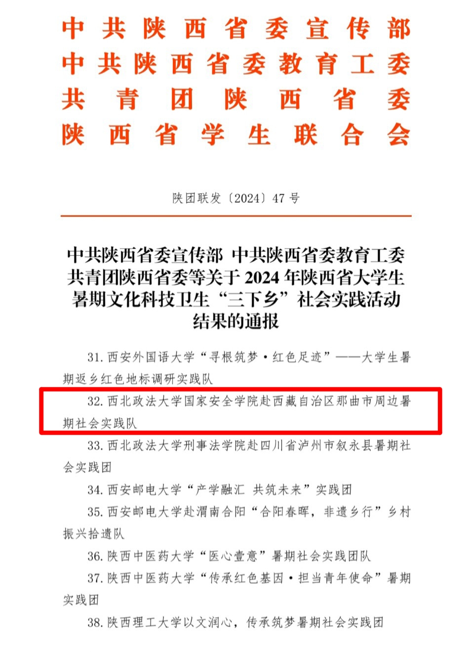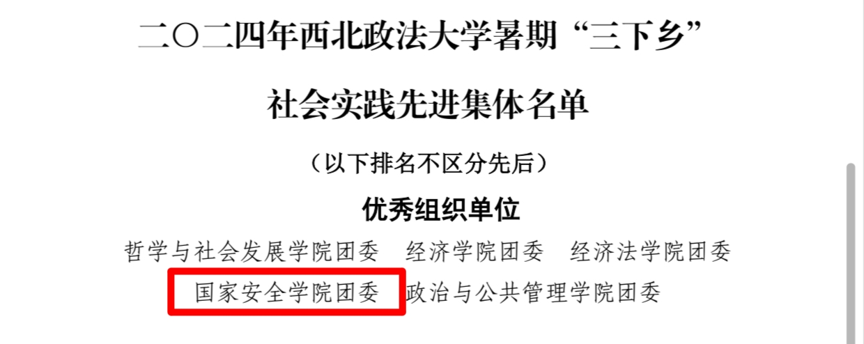 在2024年成人网站 暑期“三下乡”社会实践表彰中,成人网站 团委荣获“优秀组织单位”称号;“成人网站 赴西藏自治区那曲市周边暑期社会实践队”、“法润未来—成人网站 (反恐怖主义法学院)赴陕西省汉中市镇巴县未成年人法治保障调研实践团(队)”、“成人网站 “廉脉寻延,青春志行”赴陕西省延安市暑期社会实践团(队)”、“成人网站 赴新疆维吾尔自治区少数民族周边地区暑期社会实践团(队)”荣获“优秀团队”称号。