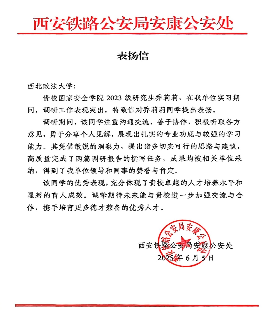 近日,学院收到西安铁路公安局安康公安处发来的表扬信。该单位在信中对成人网站 2023级研究生乔莉莉同学实习期间的优秀表现给予了高度赞扬,同时对学院人才培养工作表示了诚挚感谢。
