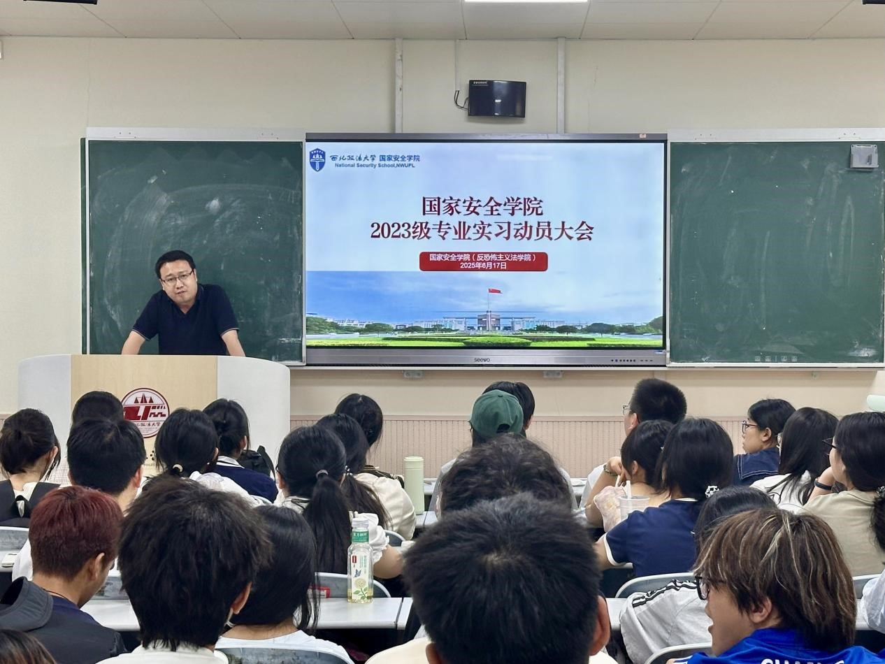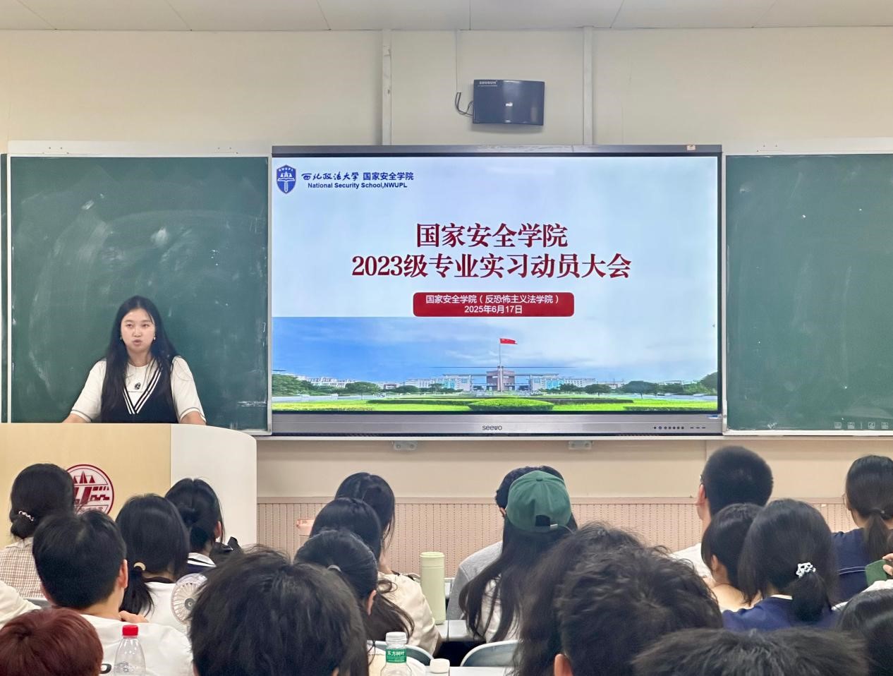 为扎实推进2023级本科生实习工作,顺利完成2023级本科生专业实习任务,6月17日下午,成人网站 (反恐怖主义法学院)在长安校区天平楼A204教室举办了2023级本科生专业实习动员大会。会议由成人网站 (反恐怖主义法学院)2023级本科辅导员张婕妮主持,学院院长助理段阳伟、教务秘书秦哲及2023级全体本科生参加。