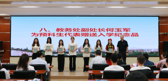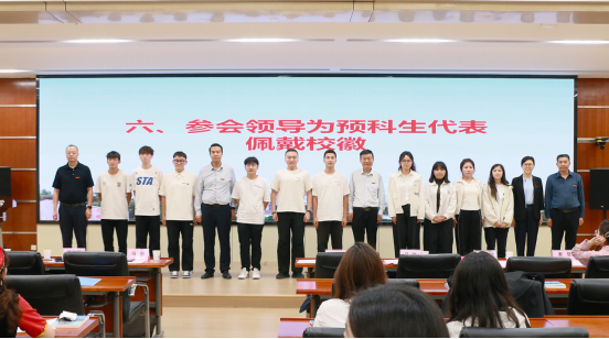 典礼上,全体参会领导为预科生代表佩戴校徽,杨明为预科生辅导员王真颁发聘书,何玉军为预科生代表赠送入学纪念品,马玲为预科生代表赠书。