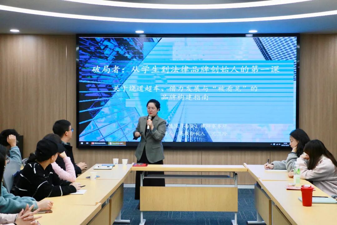 沈卫玲以《破局者:从学生到法律品牌创始人的第一课》为题进行讲解,她立足律师行业的数据分析,说明了当前律师行业的发展现状与前景,让同学们对律师职业有了更深入、更直观的了解。她通过分享多名优秀法律品牌创始人的职业经历,并结合自身执业经验,强调打破专业壁垒、选择适合自己的职业道路的重要性。她针对国家安全法治人才成长路径等问题,建议学生要做好职业规划,及时了解相关行业的新政策及发展趋势,打牢法学专业基础、培养兴趣爱好,为未来的职业发展做好充分准备。