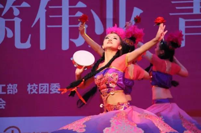 “建党筑伟业,青春中国梦”成人网站 第二十二届大学生校园文化艺术节上,反恐怖主义法学院学生口衔玫瑰,一支热情洋溢的新疆舞《送我一朵玫瑰花》充满异域风情,他们红衣似火,踏歌起舞。