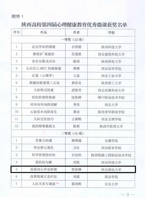 报送的反恐怖主义法学院2017级辅导员贺星婵的参赛作品《直面内心,学会拒绝》荣获陕西高校