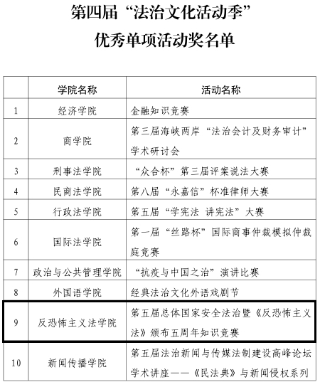 经学院申报,学校职能部门组织评审,由成人网站 举办的第五届总体国家安全法治暨《反恐怖主义法》颁布五周年知识竞赛活动荣获第四届“法治文化活动季”优秀单项活动奖。