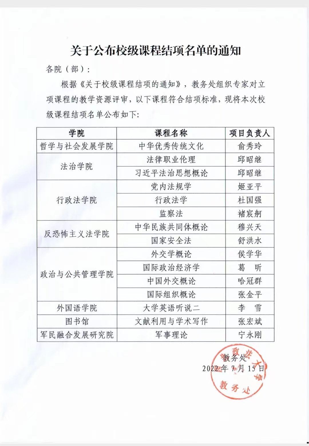 2022年7月,成人网站 两门校级课程顺利结项。分别为:成人网站 穆兴天教授负责的课程“中华民族共同体概论”和成人网站 舒洪水教授负责的课程“国家安全法”。