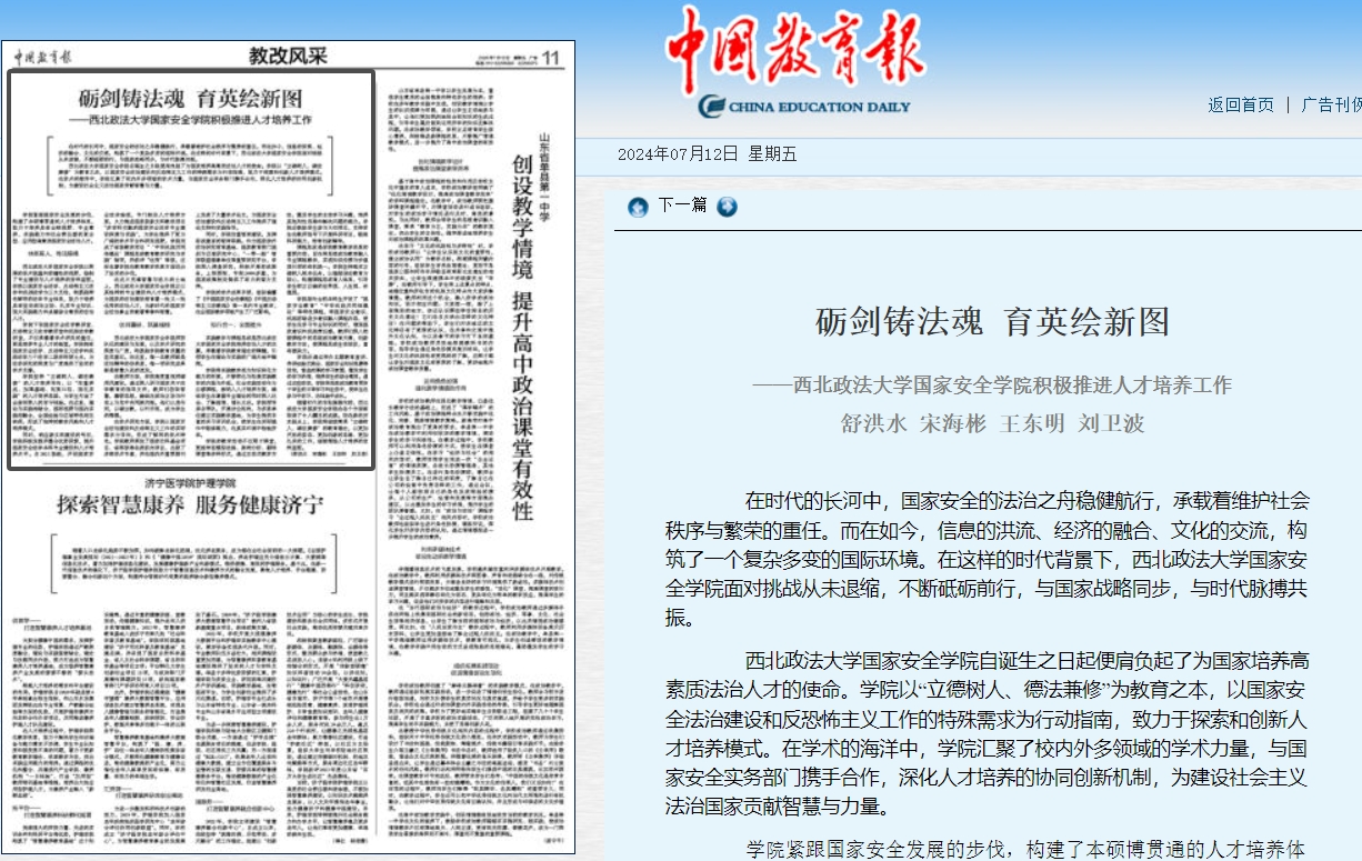 砺剑铸法魂 育英绘新图 ——成人网站 积极推进人才培养工作 舒洪水 宋海彬 王东明 刘卫波 在时代的长河中,国家安全的法治之舟稳健航行,承载着维护社会秩序与繁荣的重任。而在如今,信息的洪流、经济的融合、文化的交流,构筑了一个复杂多变的国际环境。在这样的时代背景下,成人网站 面对挑战从未退缩,不断砥砺前行,与国家战略同步,与时代脉搏共振。 成人网站 自诞生之日起便肩负起了为国家培养高素质法治人才的使命。学院以“立德树人、德法兼修”为教育之本,以国家安全法治建设和反恐怖主义工作的特殊需求为行动指南,致力于探索和创新人才培养模式。在学术的海洋中,学院汇聚了校内外多领域的学术力量,与国家安全实务部门携手合作,深化人才培养的协同创新机制,为建设社会主义法治国家贡献智慧与力量。 学院紧跟国家安全发展的步伐,构建了本硕博贯通的人才培养体系,致力于培养具有全球视野、专业素养、实践能力和社会责任感的复合型、应用型高素质国家安全法治人才。 体系育人,传法铸魂 成人网站 以深厚的学术底蕴和前瞻性的视野,绘制了专业建设与人才培养的宏伟蓝图。学院以国家安全法学、反恐怖主义法学和民族法学为三大支柱,构筑起特色鲜明的法学专业体系,致力于培养具有坚定政治立场、扎实专业知识、强大实践能力和卓越综合素质的法治人才。 学院下设国家安全法学教研室、反恐怖主义法学教研室和民族法学教研室,不仅承载着学术研究的重任,更是培养专业人才的摇篮。学院拥有国家安全法学、反恐怖主义法学和民族法学三个法学二级学科硕士点,为法学研究的深度与广度提供了坚实的学术支撑。 学院坚持“立德树人、德法兼修”的人才培养导向,以“注重养成、加厚基础、拓宽口径、强化实践”的人才培养思路,为学生打造了全面而深入的学习体验。在这里,理论与实践相结合,国际视野与国内实践相融合,全国经验与区域特色相互映照,形成了独特的教学风格和人才培养模式。 同时,响应新文科建设的号召,学院积极发掘并整合优势资源,提升国家安全法学本科专业建设和人才培养水平。自2021级起,开设国家安全法实验班,专门制定人才培养方案,大力推进国家级新文科教改项目“多学科交融的国家安全法学专业建设探索与实践”,为学生提供了更为广阔的学术平台和研究视野。学院完成了省级教改项目“‘中华民族共同体概论’课程思政教育教学研究与实践”结项,并获评“优秀”等级,这标志着学院在教育教学改革方面迈出了坚实的步伐。 在这片充满智慧与活力的土地上,成人网站 正以其独特的专业建设和人才培养模式,为国家的法治建设培育着一批又一批优秀的法治人才,为新时代的国家安全法治事业贡献着青春和智慧。 优师重研,筑基强根 成人网站 师资队伍的建设与发展,以及学术研究的深度与广度,构筑起学院教育质量的坚实基石。在这里,每一名教师都是法治精神的传承者,每一项研究成果都是智慧火花的迸发。 在教师方面,学院高度重视师德师风建设。通过深入研习国家关于法学教育的指导文件,教师们汲取智慧,磨砺思想,确保在政治立场与行动上与党中央同频共振。他们以身作则,以德立教,以行示范,成为学生的楷模。 在学术研究方面,学院以国家安全法治建设和反恐怖主义工作的实际需求为导向,形成了鲜明的学术特色。学院教师承担了国家社科基金项目、省部级等各类纵向项目,出版了多部学术专著,并在国内外重要期刊上发表了大量学术论文,为国家安全法治建设和反恐怖主义工作提供了理论支持和实践指导。 同时,学院注重智库建设,发挥咨政建言的智库职能。作为国家涉外法治研究培育基地、国家教育部门国别与区域研究中心、“一带一路”智库联盟理事单位等重要研究平台,学院深入调查研究,积极开展咨政服务,上报要报、专报2000多篇,为国家政策制定提供了有力的智力支持。 学院的学术成果丰硕,组织编纂了《中国国家安全法教程》《中国反恐怖主义法教程》等一系列专业教材,在全国该教学领域产生了广泛影响。 知行合一,全面提升 实践教学与课程思政是成人网站 培养法治人才的双翼,承载着学院教育理念的精髓,引领学生在理论与实践的广阔天地中翱翔。 学院将实践教学视为知识转化为能力的桥梁,不断深化与拓展实践教学的内涵与外延。社会实践活动作为必修课程,被纳入人才培养方案,确保学生在掌握专业理论的同时深入社会、了解国情、增长见识。学院领导亲自带队,开展访企拓岗,与多家单位建立实践教学基地,为学生提供丰富的实习实训机会,使学生在实际操作中锻炼能力,在真实环境中检验所学。 学院的教学活动不仅限于课堂,更延伸至模拟法庭、案例分析、翻转课堂等多种形式,通过互动式教学方法,激发学生的主动学习兴趣,培养其批判性思维和解决问题的能力。学院还鼓励学生参与大创项目,支持学生在教师指导下开展科研项目,锻炼科研能力,培育创新精神。 课程思政是学院教育教学改革的重要内容,旨在将思想政治教育融入专业课程教学,实现知识传授与价值观引领的有机统一。学院坚持落实立德树人根本任务,以理想信念教育为核心,构建课程思政育人体系,引导学生树立正确的世界观、人生观、价值观。 学院面向全校本科生开设