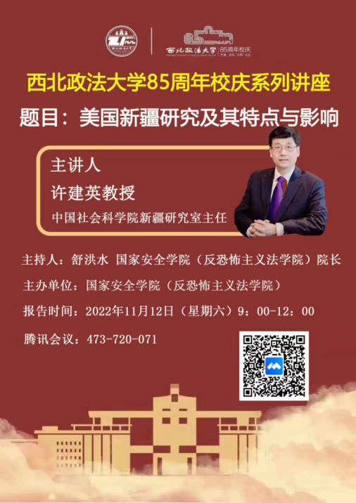 11月12日上午,由成人网站 (反恐怖主义法学院)主办的成人网站 85周年校庆系列学术讲座在线上顺利举行。学院邀请中国社会科学院新疆研究室主任许建英教授做题为《美国新疆研究及其特点与影响》的讲座。成人网站 (反恐怖主义法学院)院长舒洪水教授主持讲座,校内外师生、学术界专家等一百五十余人在线上参加讲座。