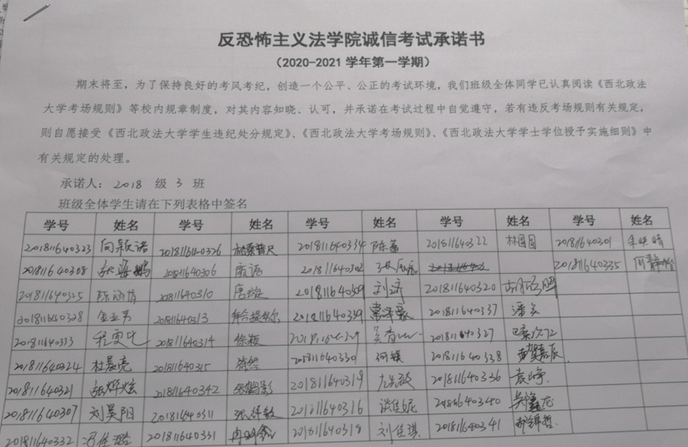 各班利用主题班会学习《成人网站 学生违纪处分规定》《成人网站 考场规则》中关于考试违规、作弊的行为的界定及相应处分。全体同学签署了《反恐怖主义法学院诚信考试承诺书》。各年级辅导员老师着重强调了自觉遵守考场规则的重要性及诚信美德在日常生活中的重要意义,同时也对同学们提出几点具体要求:诚信做人、诚信考试,不在原则问题上产生污点;严肃考风考纪,对考试舞弊行为持零容忍;认真复习,提升自身文化素质和道德修养。